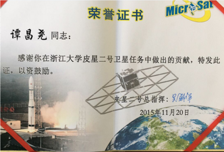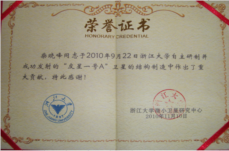 浙江大學微小衛(wèi)星中心為我柴總頒發(fā) “皮星一號” 榮譽證書