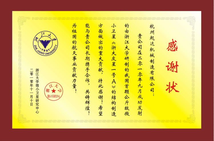 浙江大學微小衛(wèi)星中心為我公司頒發(fā) “皮星二號” 感謝狀